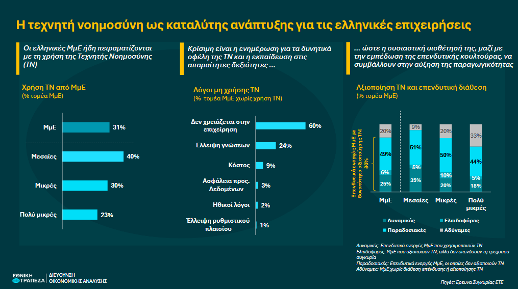 Η ενεργοποίηση αυτού του κρίσιμου – ακόμη τεχνολογικά αδρανούς – τμήματος του επιχειρείν αποτελεί κομβικό στοίχημα για την ελληνική οικονομία, καθώς η ευρύτερη διάχυση της ΤΝ, σε συνδυασμό με την ενίσχυση των επενδύσεων, μπορεί να λειτουργήσει ως διπλός καταλύτης για το κλείσιμο του παραγωγικού κενού με την υπόλοιπη Ευρώπη.