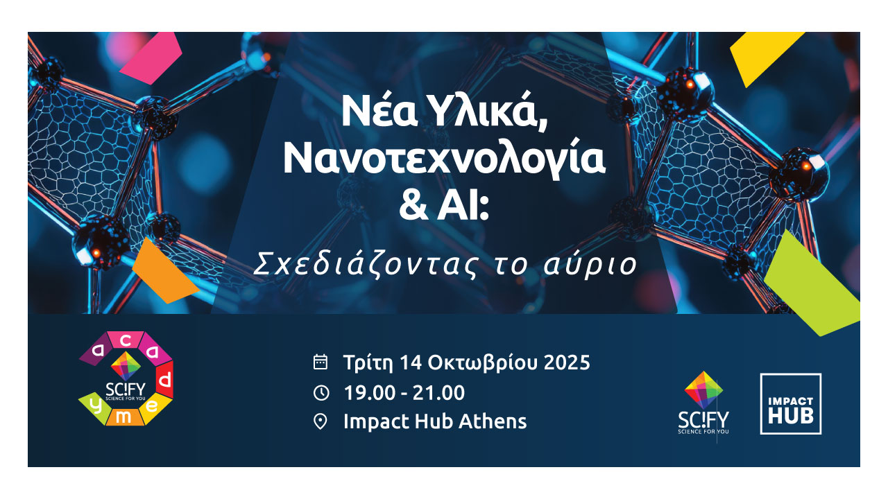 Η Science for You – SciFY σας προσκαλεί σε μία εκδήλωση SciFY Academy αφιερωμένη στα νέα καινοτόμα υλικά, τη Νανοτεχνολογία και την Τεχνητή Νοημοσύνη. Η εκδήλωση “Νέα Υλικά, Νανοτεχνολογία & ΑΙ: Σχεδιάζοντας το αύριο” θα πραγματοποιηθεί την Τρίτη 14 Οκτωβρίου 2025, στις 19:00, στο Impact Hub Athens (Καραϊσκάκη 28, Αθήνα). Διακεκριμένοι ερευνητές, καθηγητές διεθνούς φήμης και στελέχη επιχειρήσεων θα μας μιλήσουν με απλά λόγια για το θέμα.